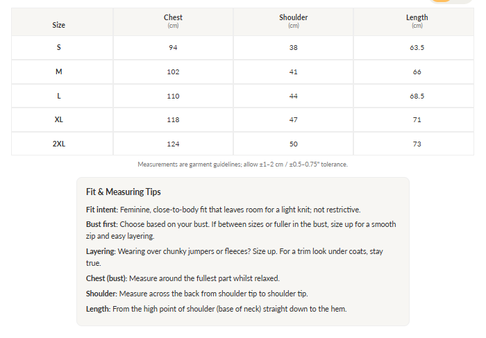 The Heated Gilet Pro is available in sizes XS to XL to fit various body types.