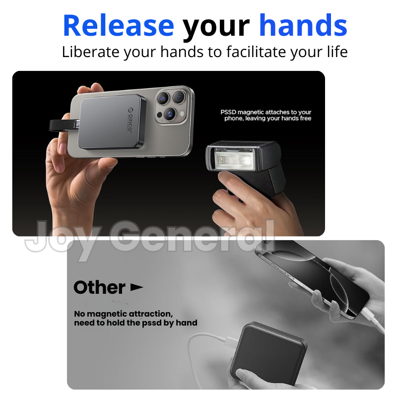 Forget bulky portable hard drives. At just 68 × 60 × 7.5mm and only 0.75cm thick, the ORICO K20Mini is slimmer than a bank card. The strong MagSafe-compatible magnetic attachment keeps it securely in place on your iPhone while filming, and the included magnetic ring allows you to attach it to any device. Lightweight, ultra-thin, and built from aluminium alloy for heat dissipation, this portable storage drive is made for creators on the move.