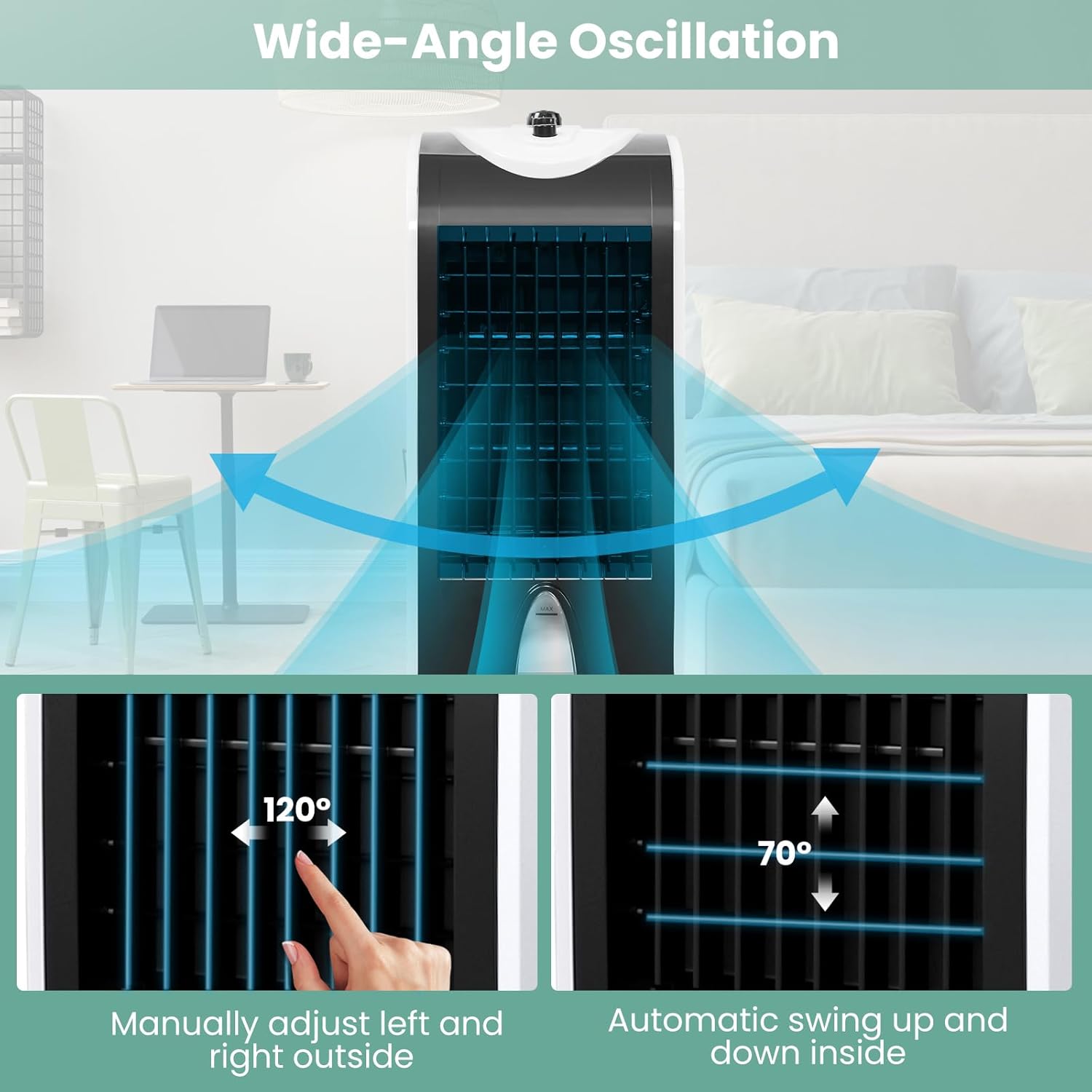 This evaporative cooling system does more than just cool—it also humidifies and circulates air, making it perfect for dry indoor environments.