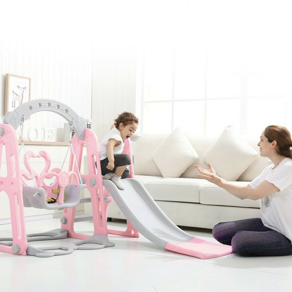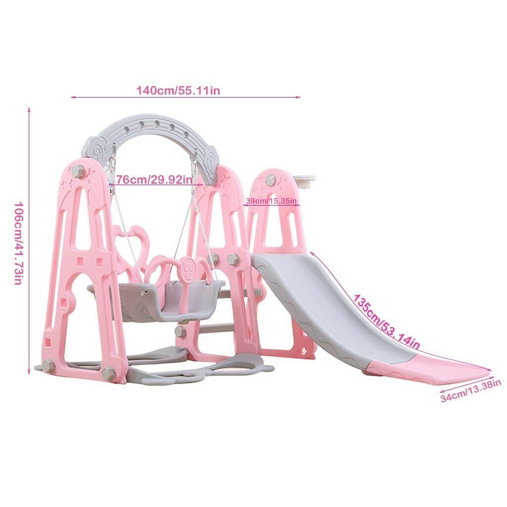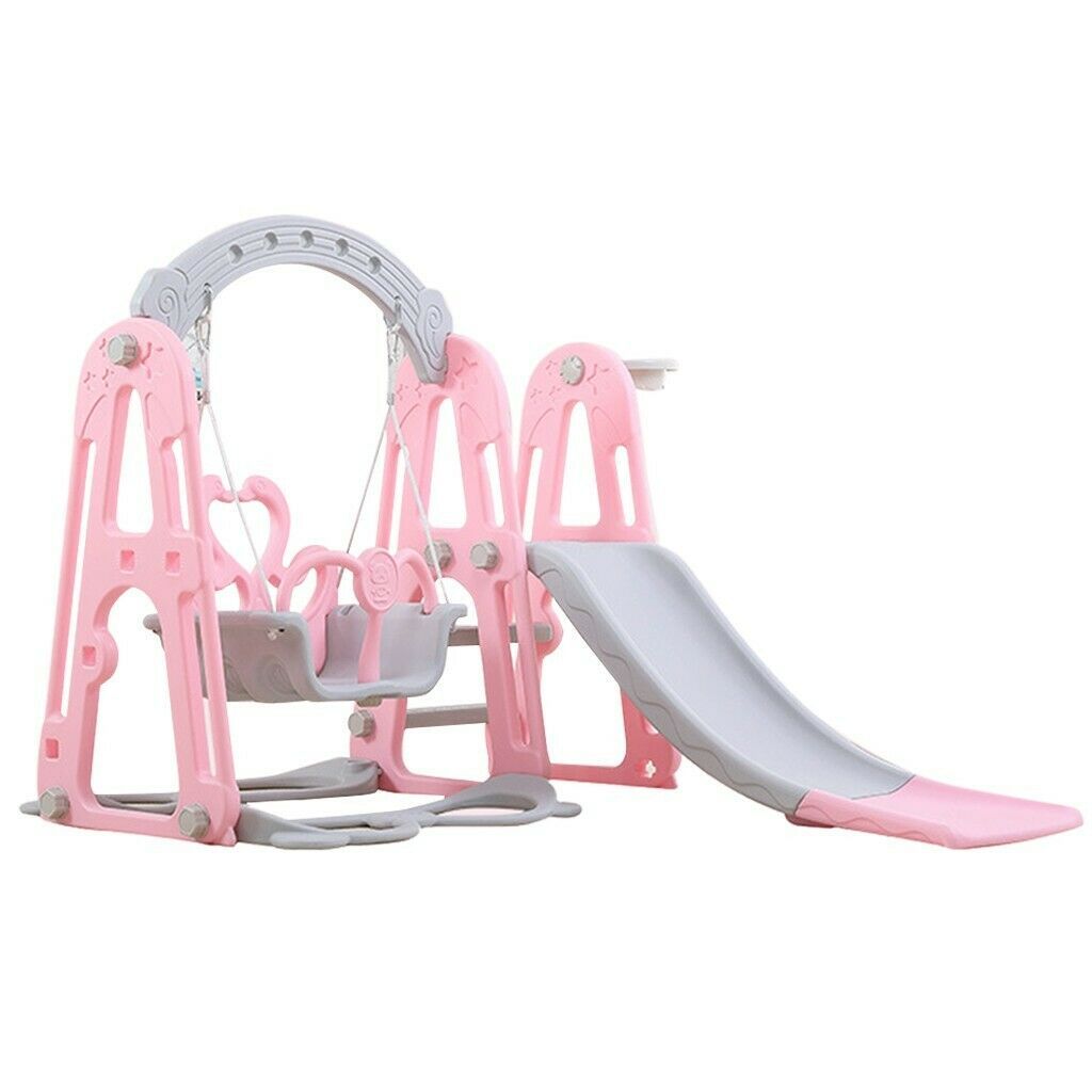 Bright and colorful 3-in-1 playing Slide Swing Set offers 3 functions: a smooth slide, a sturdy swing, a basketball hoop and to the which is intended for family and domestic outdoor use. All activity elements are appropriately sized for toddlers.