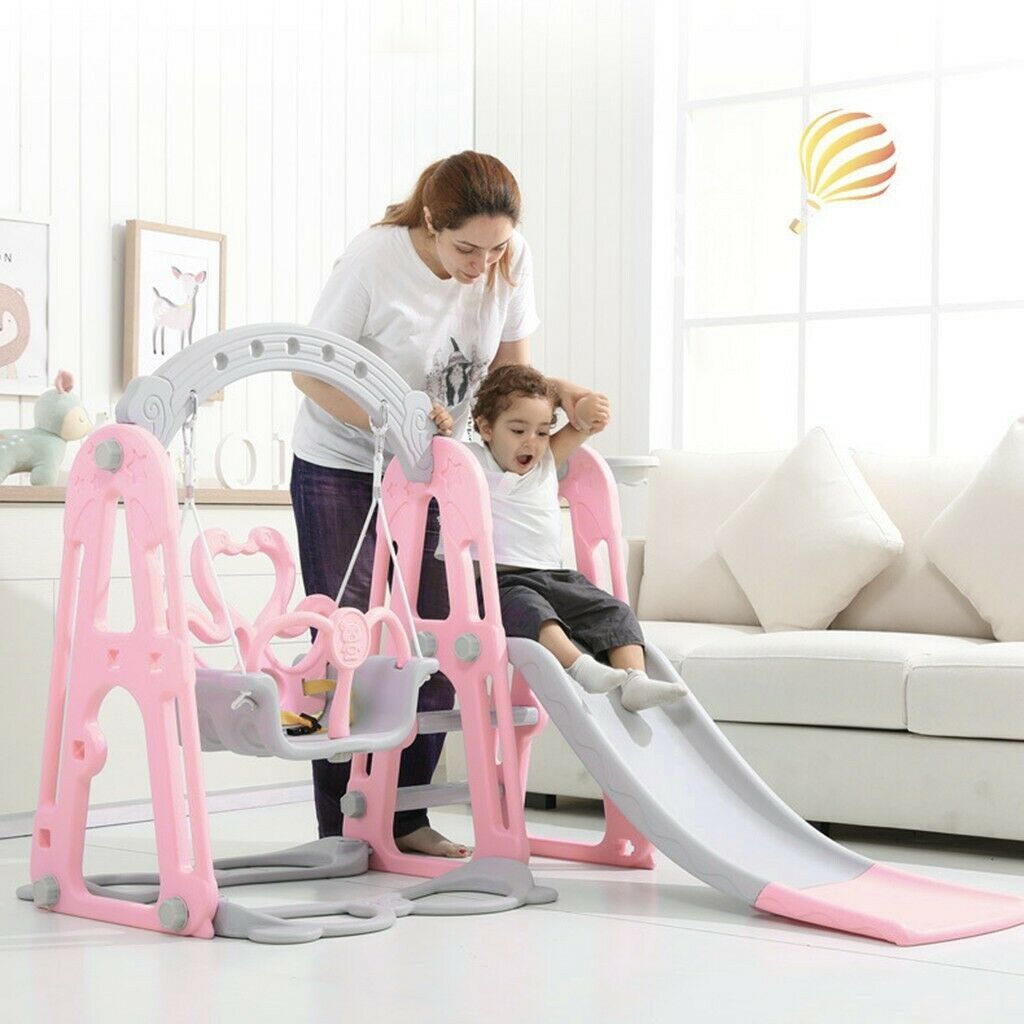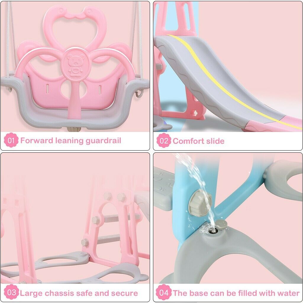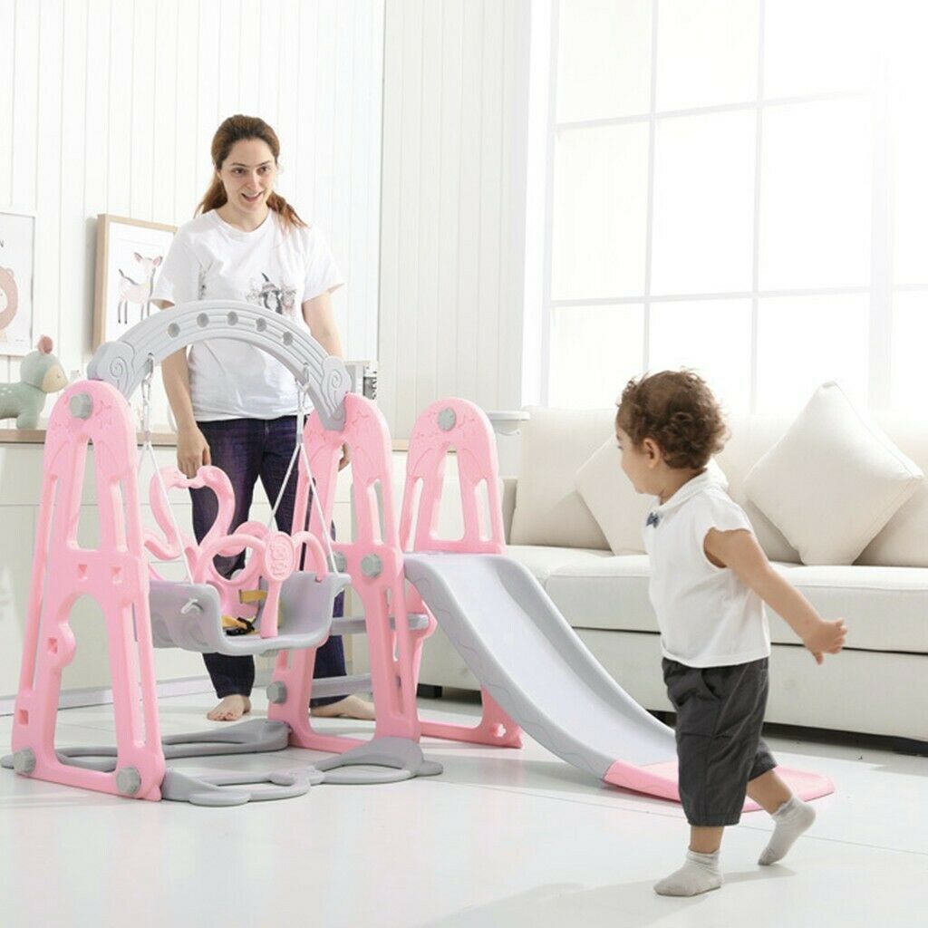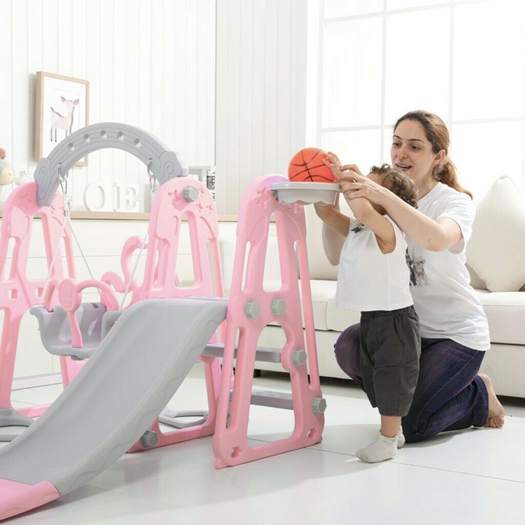 Bright and colorful 3-in-1 playing Slide Swing Set offers 3 functions: a smooth slide, a sturdy swing, a basketball hoop and to the which is intended for family and domestic outdoor use. All activity elements are appropriately sized for toddlers.